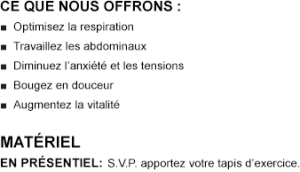 Ce cours propose des exercices inspirés du Pilates et des exercices plus traditionnels afin d’apprendre à travailler votre stabilité ( CORE) et votre équilibre. Le cours sera donné en deux parties. Dans la même séance vous apprendrez la base de la respiration, le positionnement, l’activation des stabilisateurs incluant le plancher pelvien et la ceinture abdominale pour ensuite dans la deuxième partie les expérimenter en position couchée, assise avec ballon, debout ect. Vous pourrez améliorer votre posture, vos muscles profonds et votre vigueur musculaire . Tout ça pour être fonctionnel et optimal au quotidien!